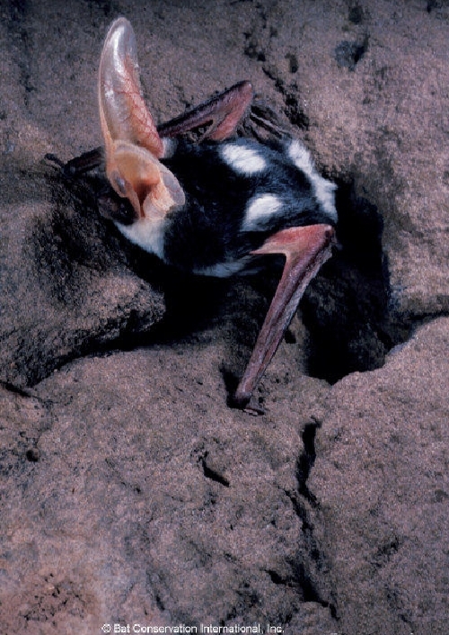 The spotted bat is perhaps the most beautifully coloured mammal of North America. It has black fur with white spots. The spots consist of two spots on the back over the shoulders, as well as one white spot on the rump. There is often a ring of white around the base of it's enormous pink ears. The fur on the under side, is usually black, with white tips.